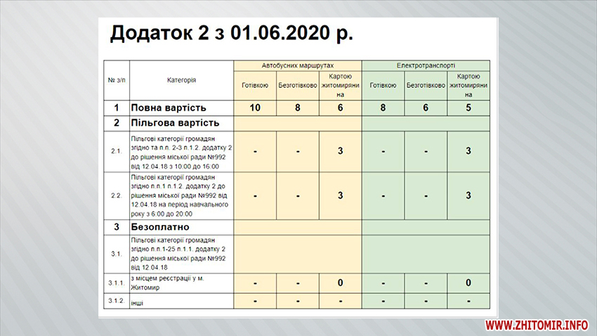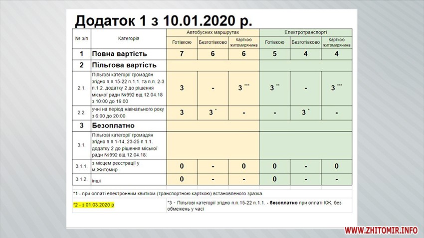 «Проєктом рішення пропонується: встановити вартість проїзду з 10 січня 2020 року на автобусних маршрутах при умові оплати готівкою - 7 грн, безготівково чи «Карткою житомирянина» - 6 грн. Щодо пільгових категорій, є умовно дві частини пільгових категорій: це ті категорії, які мають право відповідно до чинного законодавства, або у законі про соціальний захист та ті, які встановлені іншими правовими актами. Третій блок - безкоштовно, тобто всі категорії, які мають відповідно закону право на пільговий проїзд залишаються на безкоштовному перевезенні. До цього переліку не входять інваліди 3 групи та пенсіонери за віком», - говорить начальник управління транспорту і зв’язку Житомирської міськради Костянтин Підпокровний.