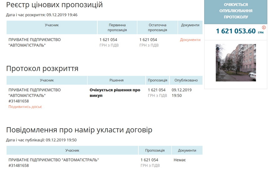За інформацією платформи ProZorro. Продажі, заявка надійшла лише від одного учасника – приватного підприємства «Автомагістраль».