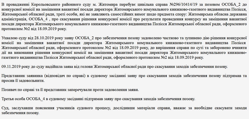 «Заяву Житомирської обласної ради про скасування заходів забезпечення позову у справі №296/10414/19 задовольнити. Скасувати ухвалу Корольовського районного суду м. Житомира від 28.10.2019 року, якою зупинено дію рішення конкурсної комісії на заміщення вакантної посади директора Житомирського комунального книжково-газетного видавництва Полісся Житомирської обласної ради, оформленого протоколом №2 від 18.09.2019 року, до вирішення справи по суті та заборонено вчиняти дії на виконання рішення конкурсної комісії на заміщення вакантної посади директора Житомирського комунального книжково-газетного видавництва Полісся Житомирської обласної ради, оформленого протоколом №2 від 18.09.2019 року», - зазначається в ухвалі, яка може бути оскаржена впродовж 15 днів з дня її проголошення.