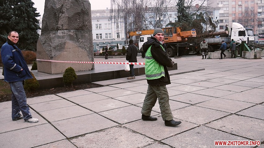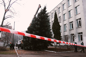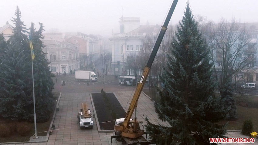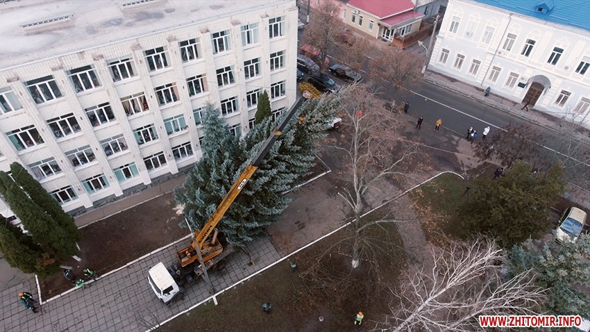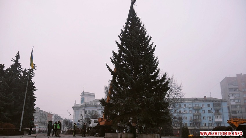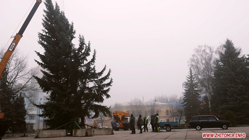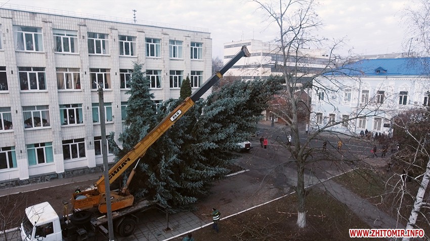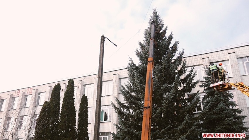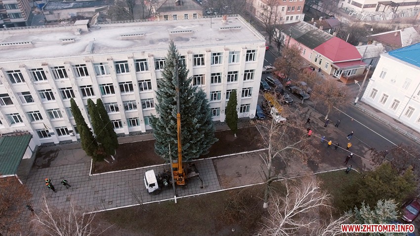 10 грудня блакитну ялину завдовжки 17 метрів, яка росла біля Житомирського міського ліцею №25 зрізали та встановили на майдані Корольова на новорічні свята.