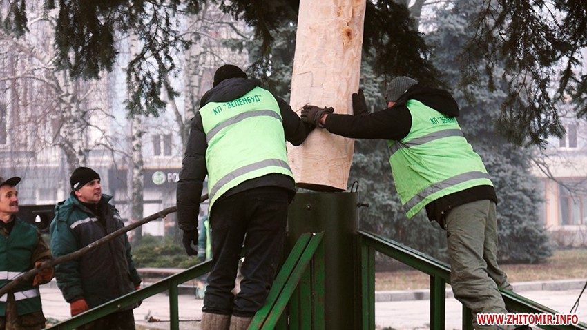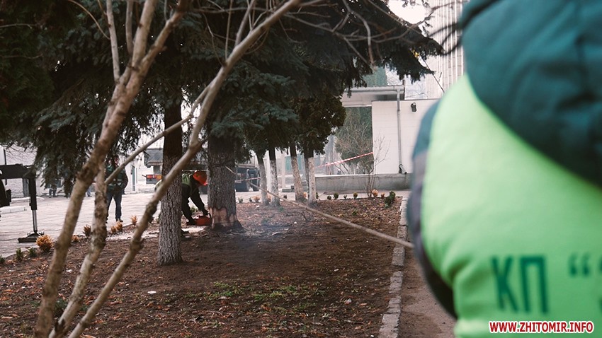 «Були складні умови зрізання ялинки. По-перше, вона розміщена дуже близько до будівлі, по-друге, електромережа. Напередодні перед зрізанням домовилися з «Міськсвітлом» на проведення робіт по зніманню їх електромереж і, в принципі, всі підготовчі роботи були здійснені вчора. Часу на зрізання ялини нам знадобилося близько 2 годин, залучили 10 людей»,- розповів в.о. директора КП «Зеленбуд» Житомирської міської ради Олександр Волокіта.
