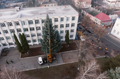 Близько 10:00 ранку територію навколо головного входу в навчальний заклад огородили та зняли електричні мережі, які були розташовані біля верхівки ялини. Після цього дерево закріпили за допомогою крану, а працівники КП «Зеленбуд» спиляли стовбур. Аби при транспортуванні не пошкодити, гілки перев'язали та завантажили на машину.