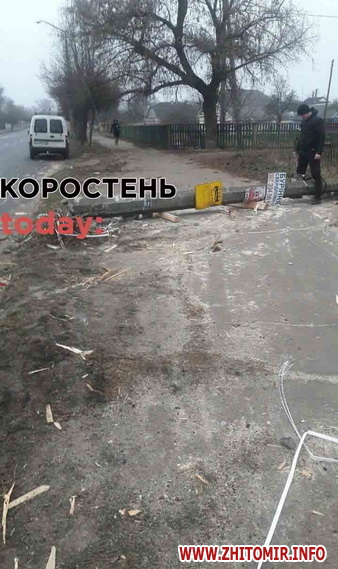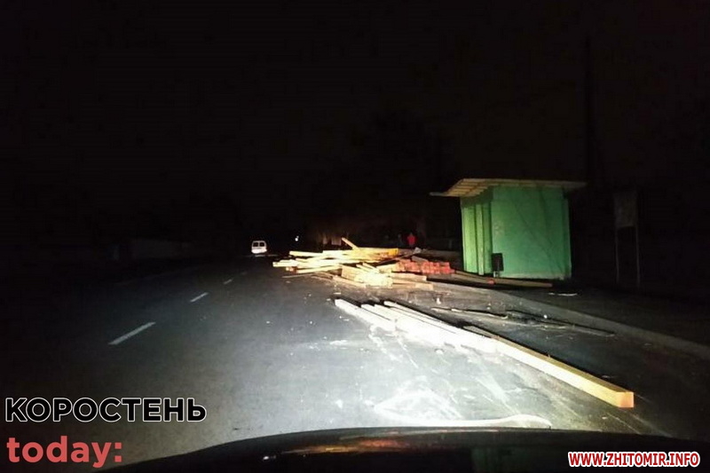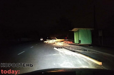 Пізно ввечері 12 грудня у місті Коростень Житомирської області водій вантажівки влаштував справжній погром на дорозі: згубив дошки, пошкодив чужі автомобілі та повалив електроопору.