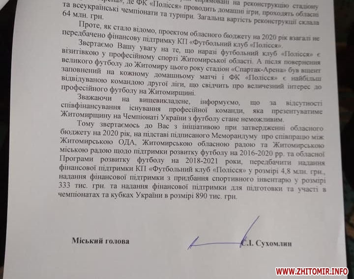 Як повідомляв Житомир.info, на засіданні бюджетної комісії Житомирської облради, яка відбулася 17 грудня 2019 року, з'ясувалось, що в проєкті бюджету на 2020 рік не передбачено грошей на потреби футбольного клубу «Полісся».