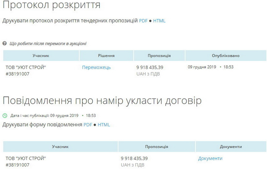 Повідомлення про початок переговорної процедури з ТОВ «УютСтрой» замовник 9 грудня опублікував на ProZorro.