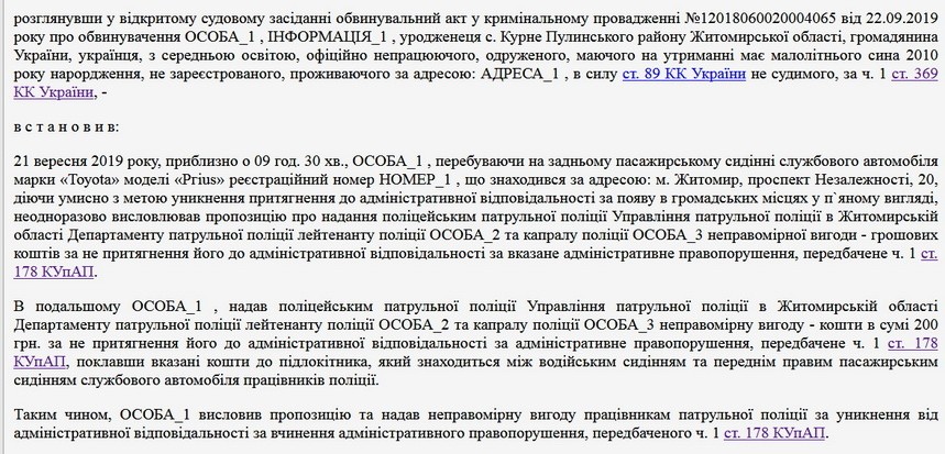 «У судовому засіданні обвинувачений свою вину в інкримінованому йому злочині визнав повністю, щиро розкаявся та показав, що 21.09.2019 вранці, перебуваючи на задньому пасажирському сидінні службового автомобіля марки «Тоуоtа» моделі «Ргіus», що знаходився за адресою: м. Житомир, проспект Незалежності, 20, з метою уникнення притягнення до адміністративної відповідальності за появу в громадських місцях у п`яному вигляді, неодноразово висловлював пропозицію про надання двом поліцейським патрульної поліції коштів та надав їм 200 грн за не притягнення його до адміністративної відповідальності за адміністративне правопорушення, передбачене ч. 1 ст. 178 КУпАП, поклавши вказані грошові кошти до підлокітника, який знаходиться між водійським сидінням та переднім правим пасажирським сидінням службового автомобіля працівників поліції. Не оспорював доказів по даній справі, здобутих органами досудового слідства, при цьому не заперечував проти розгляду кримінального провадження щодо нього у порядку ч. 3 ст. 349 КПК України. Просив суворо не карати», - йдеться у матеріалах суду.