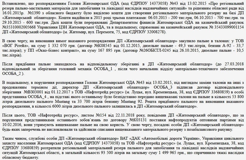 «Таким чином, службові особи ДП «Житомирський облавтодор» ВАТ «ДАК «Автомобільні дороги України», Управління цивільного захисту населення Житомирської ОДА та ТОВ «Нафтотрейд ресурс» розтратили регіональний матеріальний резерв пального для запобігання та ліквідації наслідків надзвичайних ситуацій Житомирської області, в загальній кількості 93 500 літрів на загальну суму 1 499 965 грн., що спричинило тяжкі наслідки обласному бюджету», - зазначається у матеріалах суду.