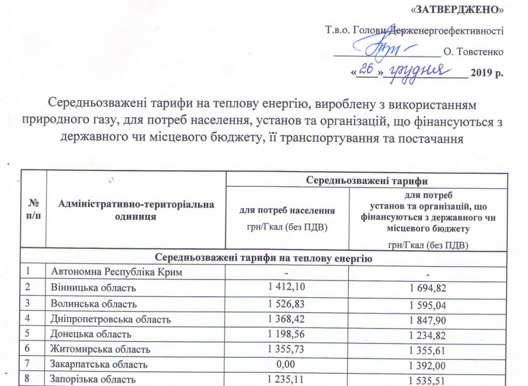 Зазначимо, що 26 грудня Держенергоефективності оприлюднило розраховані середньозважені тарифи на теплову енергію, вироблену з використанням газу, для потреб населення та бюджетних установ, а також тарифи на транспортування та постачання теплової енергії.