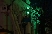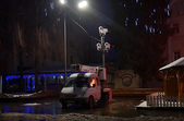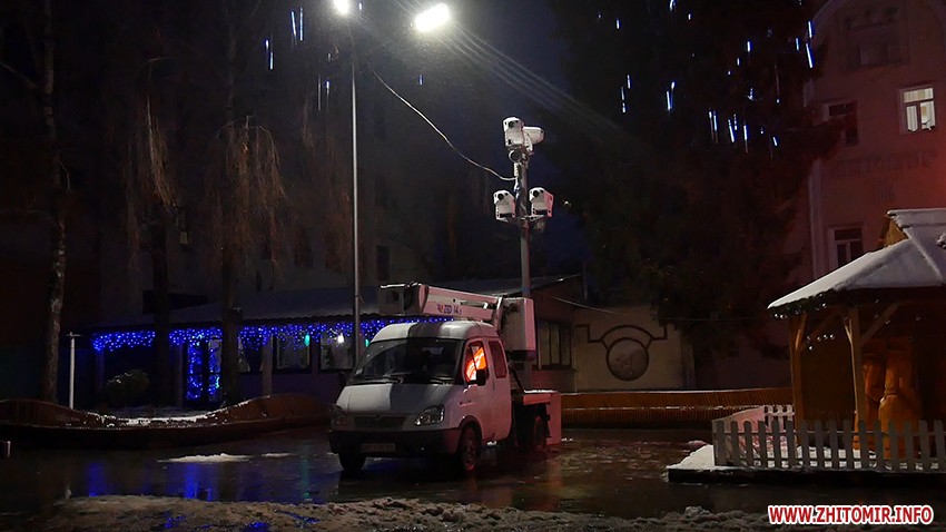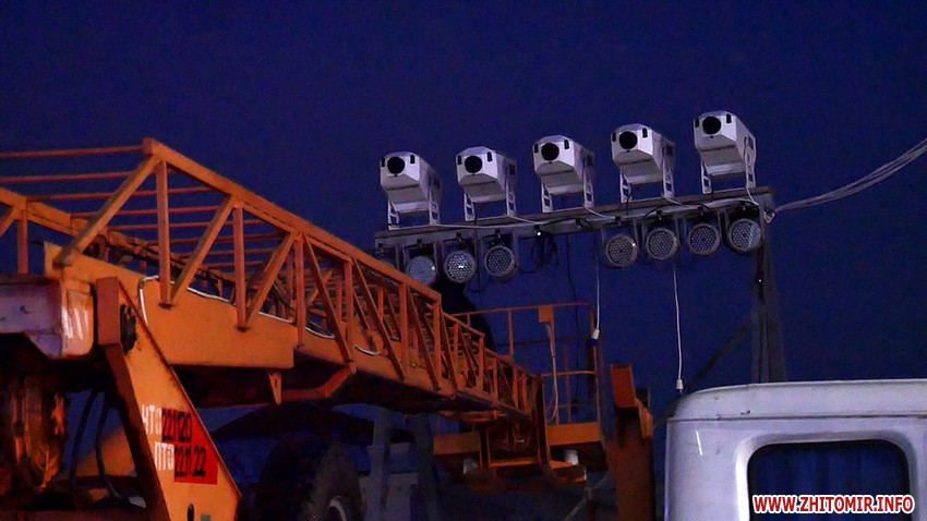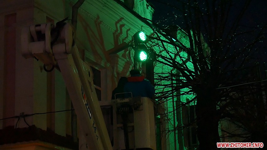 Ввечері 28 грудня на вулиці Михайлівській за допомогою автовишок фахівці продовжують монтаж та налаштування гобопроєкторів зображень. Очевидно, що за задумом ініціаторів такого встановлення, зображення мають проєктуватись на стіни будівель центральної пішохідної вулиці міста.