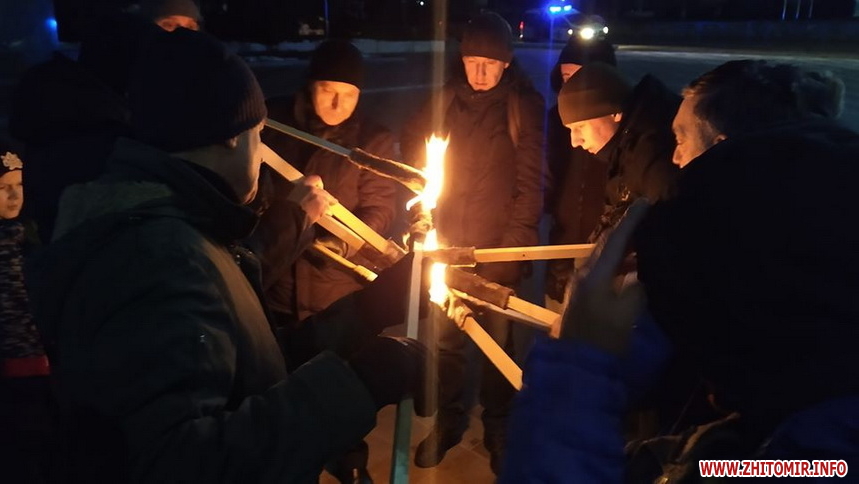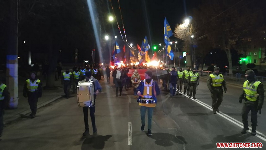 О 18:30 хода з прапорами та смолоскипами у супроводі правоохоронців рушила від пам’ятника Шевченку по Великій Бердичівській в напрямку центра міста.