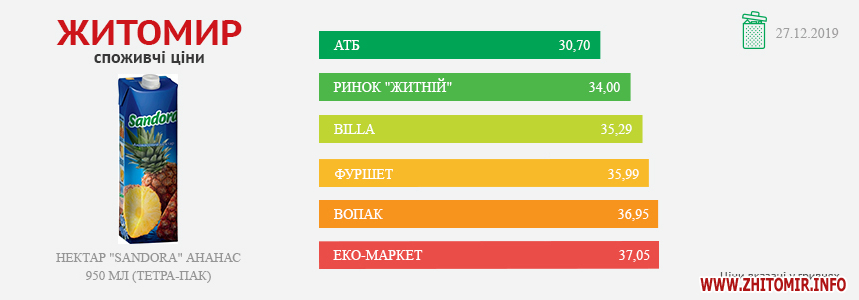 МОНІТОРИНГ ЗДІЙСНЕНО МЕТОДОМ КОНТРОЛЬНОЇ ЗАКУПІВЛІ, У МІСЦЯХ ПРОДАЖУ: AТБ, пр. Миру, 15 А, Ринок "Житній", майдан Житній ринок, Billa, пр. Миру, 15 1, Вопак, вул. Київська, 87, ЕКО-маркет, вул. Мала Бердичівська, 2/7, Фуршет, вул. Вітрука, 9 а