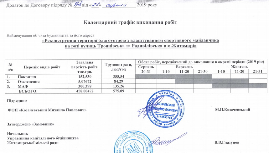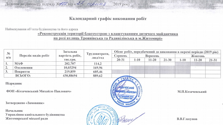Договір на виконання реконструкції території та влаштування двох майданчиків на розі вулиць Троянівська та Радивілівська УКБ уклало наприкінці серпня 2019 року, за два об’єкти взявся один підрядник – ФОП Козачевський Михайло Павлович: спортивний майданчик він мав облаштувати за 458 тис. 004,72 грн, дитячий майданчик – за 430 тис. 886,94 грн.