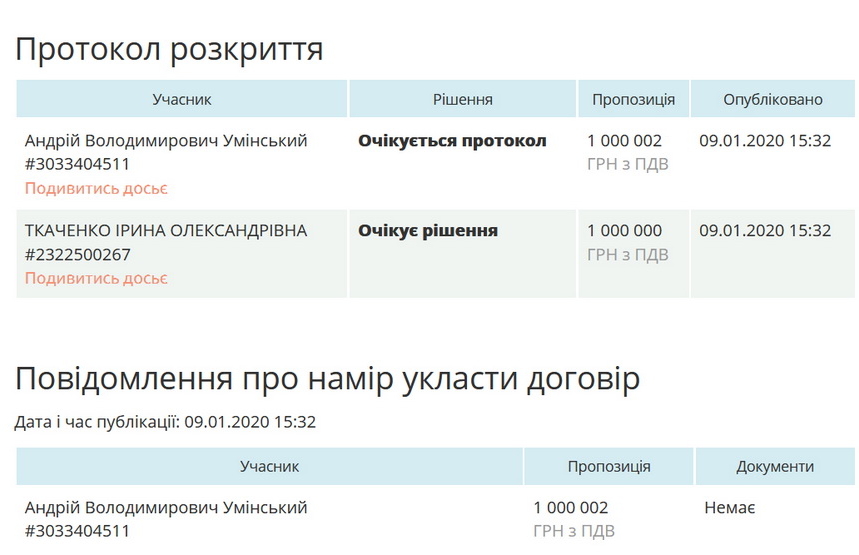 За результатами аукціону переможцем став житомирянин Андрій Володимирович Умінський (учасник №10) з пропозицією 1 млн 2 грн, що на 2 гривні більше, ніж у Ірини Олександрівни Ткаченко – матері Бориса Ткаченка, який на позачергових парламентських виборах 2019 року балотувався до Верховної Ради по Житомирському одномандатному округу №62.