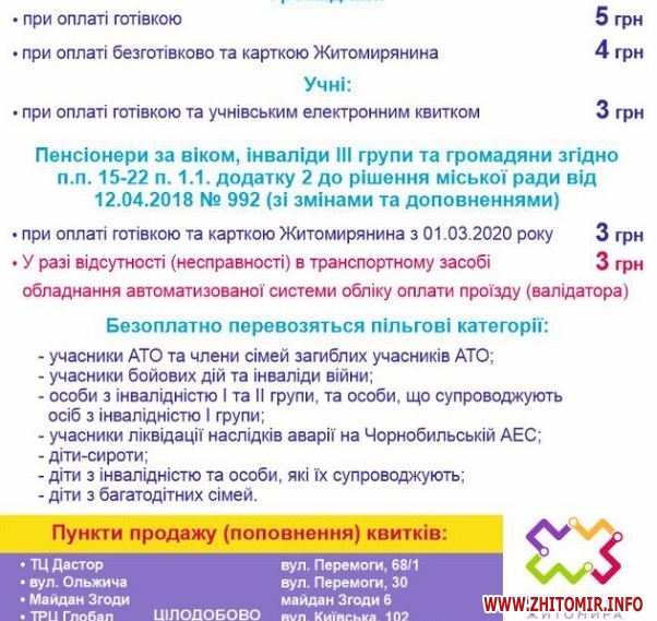 «В нашому комунальному транспорті, говоримо спочатку про електротранспорт, подорожчання проїзду відбудеться з 3 гривень до 4 (за умови безготівкової форми оплати) та до 5 гривень (готівкова форма оплати). Безготівкова форма оплати має на увазі те, що ми можемо розраховуватись карткою житомирянина, якщо вона поповнена, банківською карткою, або транспортною карткою. Якщо ми говоримо про автобусні перевезення, про автобусні маршрути, яких у нас в місті 23, то там проїзд подорожчає до 6 гривень (безготівкова форма оплати) та до 7 гривень (готівкова форма оплати). Учні їздять по 3 гривні, при наявності учнівського квитка. Поки рішення виконкому було із обмеженням по часу, але в подальшому, я думаю, ми будемо розглядати питання, щоб або обмеження по часу збільшити, або взагалі його прибрати. Для пенсіонерів за віком на сьогодні проїзд в електротранспорті не змінюється, він є безкоштовним. У приватного перевізника - 3 гривні з 10:00 по 16:00. При наявності карти житомирянина і безготівковій формі оплати - без обмеження по часу», - каже заступник Житомирського міського голови Олександр Шевчук.