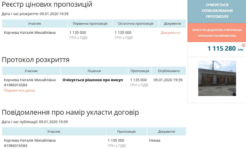 За даними ProZorro. Продажі, учасником аукціону була лише Корчева Наталія Михайлівна з пропозицією – 1 млн 135 тис. грн, що на 19 тис. 720 грн більше від стартової ціни.