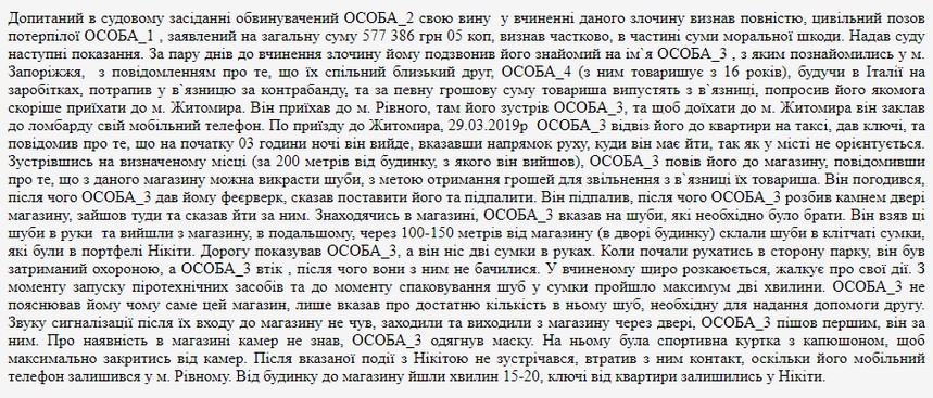 «В невстановлений день, час та місці у ОСОБА_2 разом із невстановленою слідством особою, виник спільний злочинний умисел на таємне викрадення чужого майна, поєднаний з проникненням у приміщення. Реалізуючи свій злочинний умисел, з корисливих мотивів, ОСОБА_2 за попередньою змовою із невстановленою слідством особою (…) 29.03.2019 року близько 03 години 14 хвилин підійшли до магазину «ІНФОРМАЦІЯ_3», що розташований за адресою: АДРЕСА_3 та з метою відволікання уваги мешканців від розбиття скла вітрини, запалили піротехнічний виріб, та в цей час за допомогою заздалегідь заготовленого предмету, а саме частиною гранітного каменю, розбили вікна двох вхідних метало-пластикових дверей, таким чином проникнувши до приміщення магазину», – сказано у матеріалах суду.