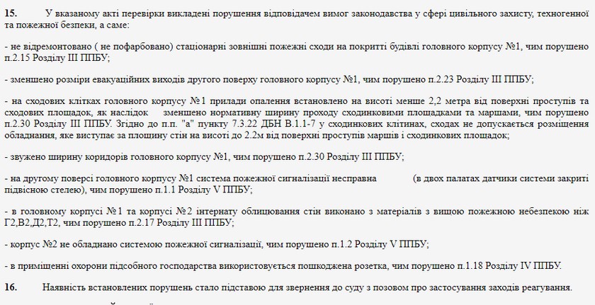 У матеріалах суду зазначається, що у жовтні 2017 року була проведена позапланова перевірка Ходорківського психоневрологічного інтернату на предмет дотримання вимог законодавства у сфері цивільного захисту, техногенної і пожежної безпеки, яка виявила численні порушення. Результатом перевірки стала вимога заборонити подальшу експлуатацію території, приміщення охорони та корпусів №1, №2 Ходорківського психоневрологічного інтернату Житомирської обласної ради, шляхом опечатування дверей та відключення від електропостачання, за адресою: Житомирська область, Попільнянський район, с. Ходорків, вул. Слобода, 102, до повного усунення виявлених порушень. Основні порушення стосувалися, зокрема, розмірів евакуаційних виходів, ширини коридорів, несправної системи пожежної сигналізації, ремонту зовнішніх пожежних сходів, тощо.