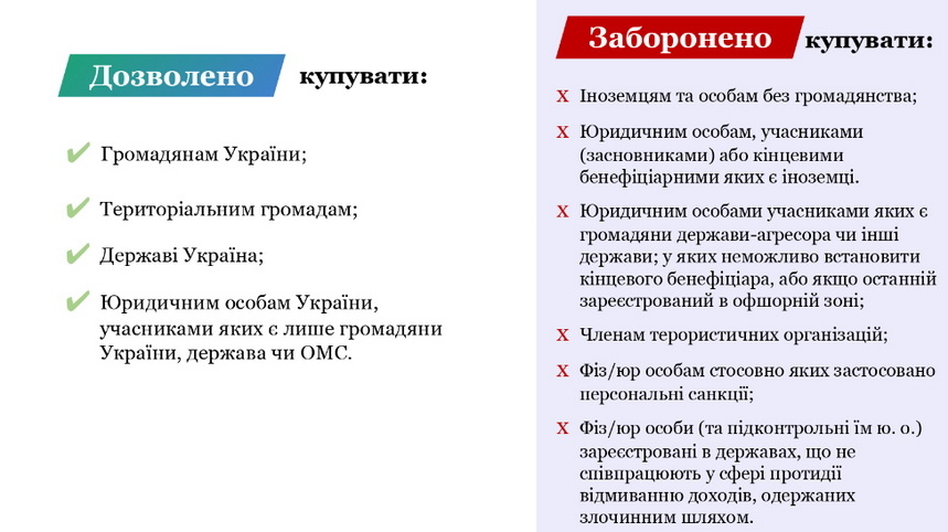 «Наразі купувати земельні ділянки зможуть громадяни України, юридичні особи України, учасниками яких є лише громадяни України, територіальні громади та держава. До референдуму заборонено купувати українську землю іноземцям і особам без громадянства», - розповів голова комітету Верховної ради з питань аграрної та земельної політики Микола Сольський.