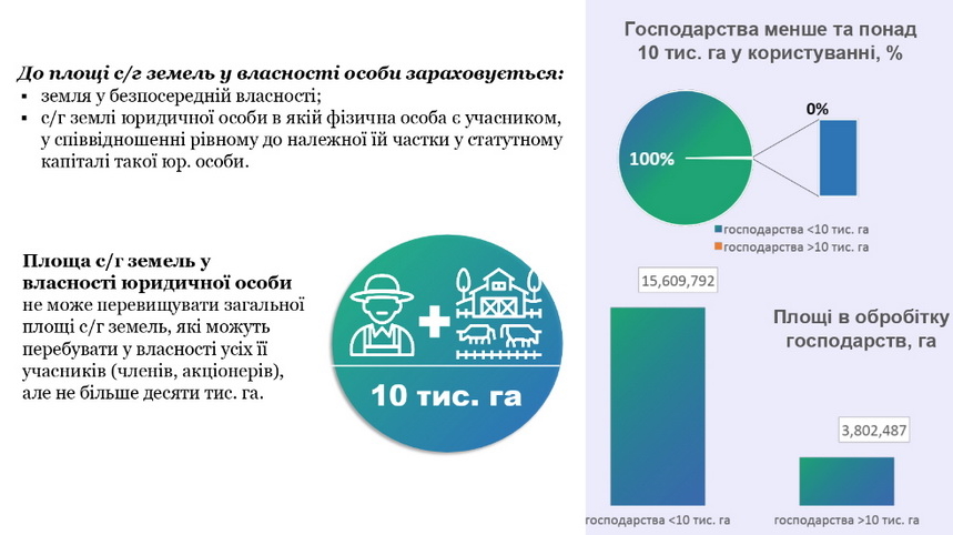 Встановлюється ліміт щодо концентрації землі в одні руки – не більше 10 тисяч гектарів. Також встановлена мінімальна ціна на землю, нижче якої її не можна продати.