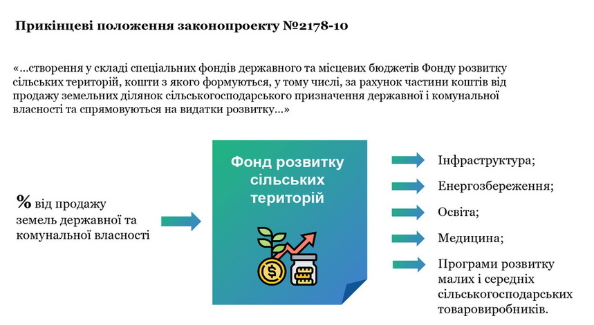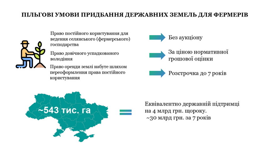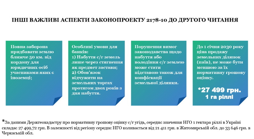 «Законопроєктом враховані всі зауваження учасників ринку та громадянського суспільства. Під час доопрацювання законопроекту були враховані інтереси українських громадян та інтереси національної безпеки України, тому його можна вважати перемогою суспільного діалогу і громадянського консенсусу. Сьогодні у світі є лише декілька країн, у яких діє мораторій на продаж сільськогосподарських земель – це Куба, Північна Корея, Венесуела, Конго, Таджикістан та Україна. Зняття цього обмеження дасть можливість власникам земельних ділянок реально реалізувати своє законне право нею розпоряджатися та встановить європейські, чесні та прозорі правила гри на ринку. Український фермер отримає можливості та стимули для розвитку у вигляді державної підтримки», - йдеться у повідомленні.