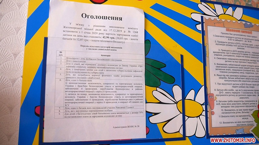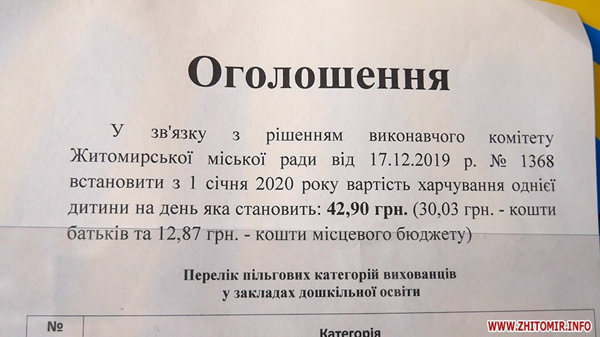 Як повідомляв Житомир.info, 17 грудня 2019 року міськвиконком ухвалив рішення про збільшення вартості харчування у школах та дитсадках: з 1 січня 2020 року з міського бюджету доплачуватимуть лише за місцевих дітей (70% - батьківська плата, 30% компенсація з міського бюджету), немісцевим же доведеться оплачувати 100% вартості харчування дитини у навчальному закладі. 9 січня у міськраді пояснили, що житомирянам достатньо принести в дитсадок чи школу копії паспортів обох батьків, а вже згодом потрібно буде пройти процедуру реєстрації місця проживання дитини і отримати відповідну довідку.