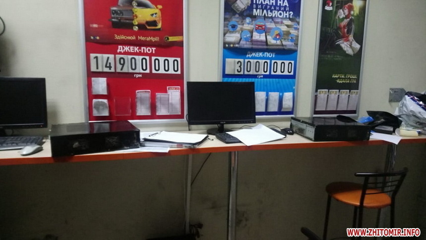 На місце події виїхала та працювала слідчо-оперативна група Житомирського відділу поліції. У ході невідкладного обшуку з приміщення закладу вилучено системні блоки та монітори, термопринтер, термінал для реєстрації лотерей, лотерейні білети та купони, буклети, чеки та гроші.