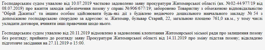 Як повідомляв Житомир.info, 22 листопада 2018 року недіючий дитсадок у житомирському парку продали на аукціоні за 6 млн 500 тис. 1 грн ТОВ «Обрій Діжитал».