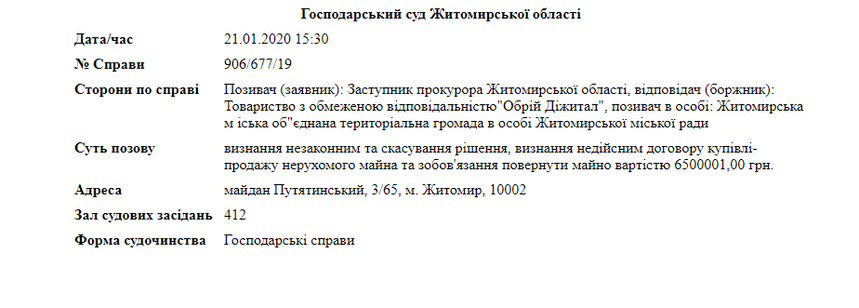 За даними єдиного державного реєстру судових рішень, у Господарському суді Житомирської області розглядається справа за позовом прокуратури в інтересах Житомирської міської ради до ТОВ «Обрій Діжитал» про визнання незаконним та скасування рішення, визнання недійсним договору купівлі-продажу нерухомого майна та зобов’язання повернути майно вартістю 6,5 млн грн.