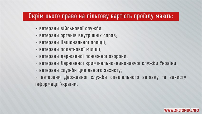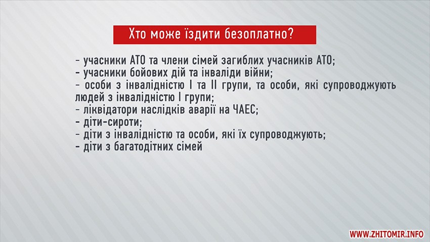 Відповідно до рішення Житомирської міської ради право на безоплатний проїзд мають: