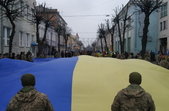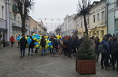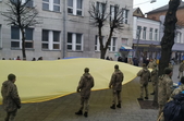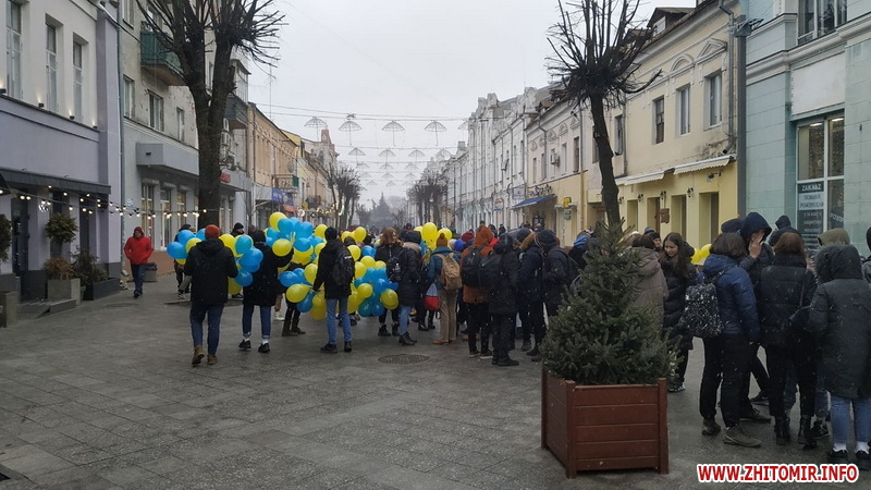 Житомиряни збираються на вулиці Михайлівській. Багато хто взяв повітряні кульки жовтого та блакитного кольорів. Військовослужбовці розгорнули величезний державний стяг.