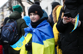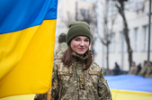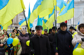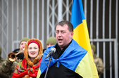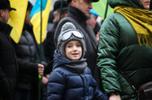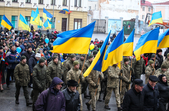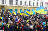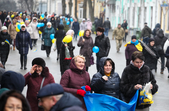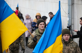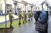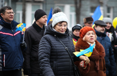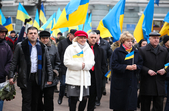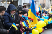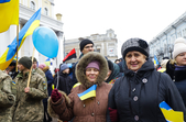 Дехто приніс з собою жовті та блакитні кульки, хтось - маленькі прапорці. А військові розгорнули на Михайлівській величезний жовто-блакитний стяг.