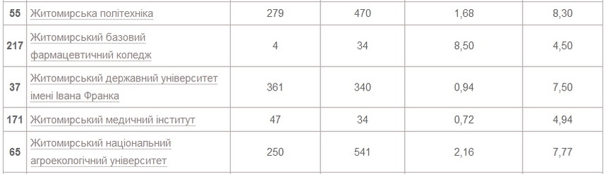 Серед п’яти житомирських вишів місця у загальноукраїнському рейтингу розподілилися наступним чином: