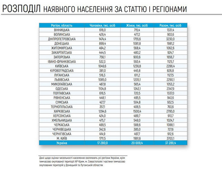 В Україні без урахування окупованих територій та громадян, які живуть за кордоном, проживає 37 мільйонів 289 тисяч осіб.
