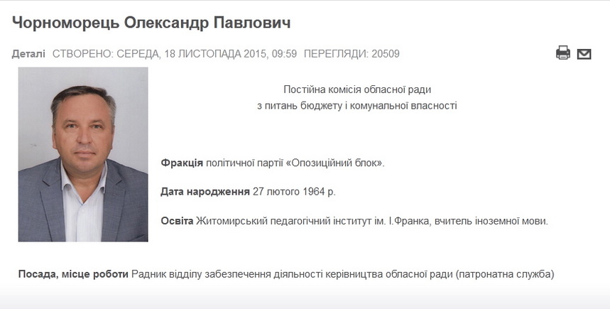 Депутат Житомирської обласної ради Олександр Чорноморець, який є членом фракції Опозиційного блоку, став радником голови облради Володимира Ширми – представника фракція Блоку Петра Порошенка, що після розпуску перетворилася на депутатську групу «Рідна Житомирщина».