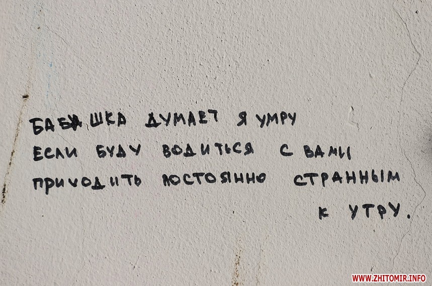 «Останнім часом з'явилося багато написів з рекламою наркотичних засобів. На жаль, більшість з них – біля шкіл. Проте є люди, які активно з ними борються: замальовують та пишуть попередження», – зауважує фотокореспондентка Житомир.info, яка 24 січня вчитувалася у вуличні написи.