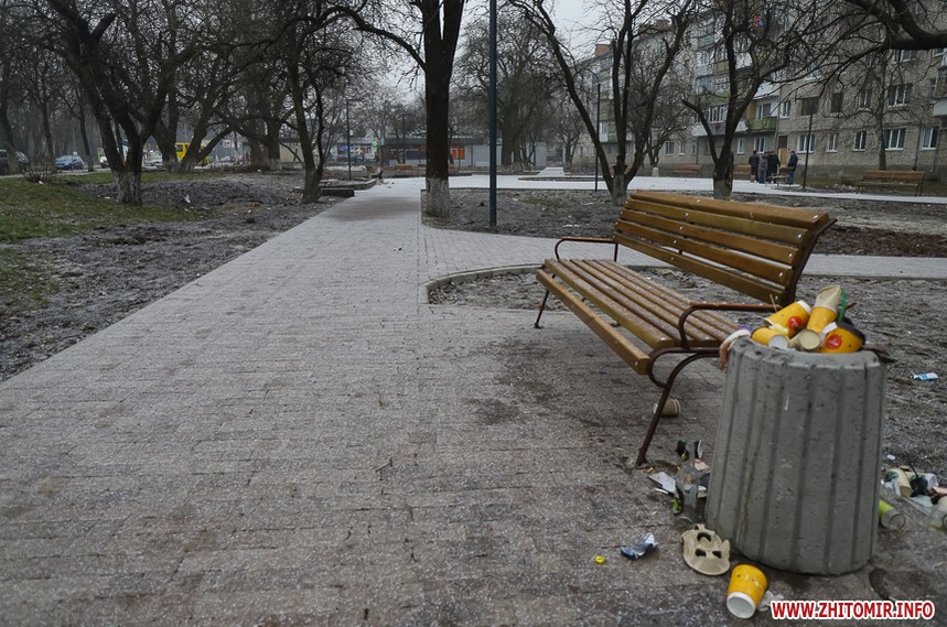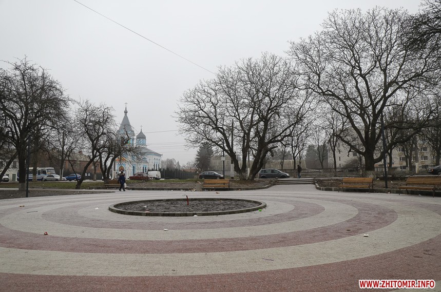 Доріжки з бруківки, сміття і лавки – такий вигляд має «Європейський сквер» на Покровській, 131, навпроти Церкви Покрови Божої Матері у Житомирі. Проєкт реалізований в рамках бюджету участі.
