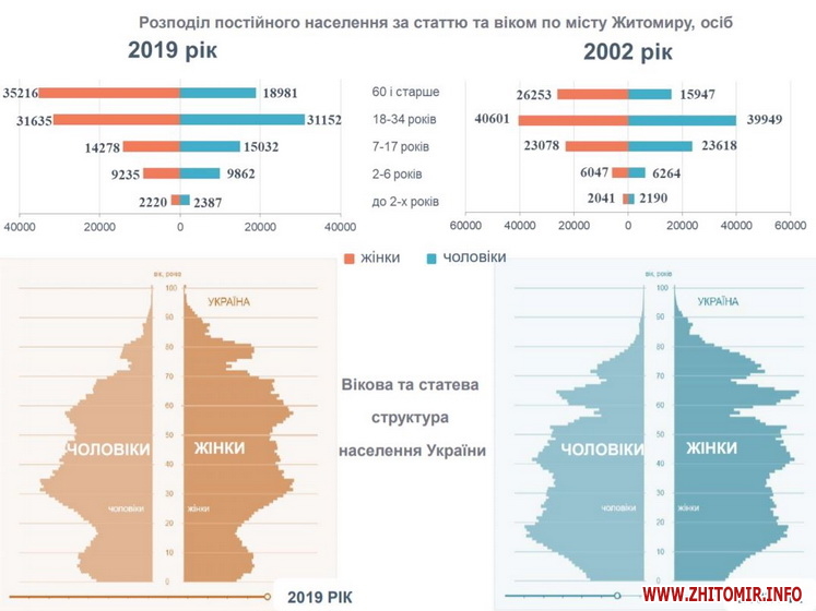 Як повідомляв Житомир.info, за даними обласного управління статистики у Житомирській області на початок 2019 року проживало 1 млн 221 тис. осіб: 652,9 тис. жінок (53,5%) та 568,1 тис. чоловіків (46,5%).