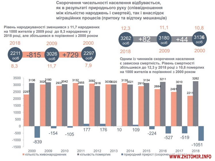 «То скільки людей проживає в Житомирі? Перепис Дубілета хоч привернув увагу до однієї з ключових проблематик держави - демографії. На основі офіційних статистичних даних ми в Департаменті економічного розвитку Житомирської міської ради підготували інфографіку про основні демографічні тренди в Житомирі за 10-15 років. Розгорнуті висновки та причинно-наслідкові зв’язки кожен бажаючий може робити сам, але в цілому картина для міста (як і України в цілому) не оптимістична: