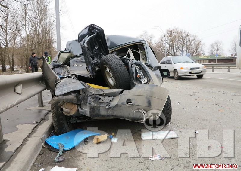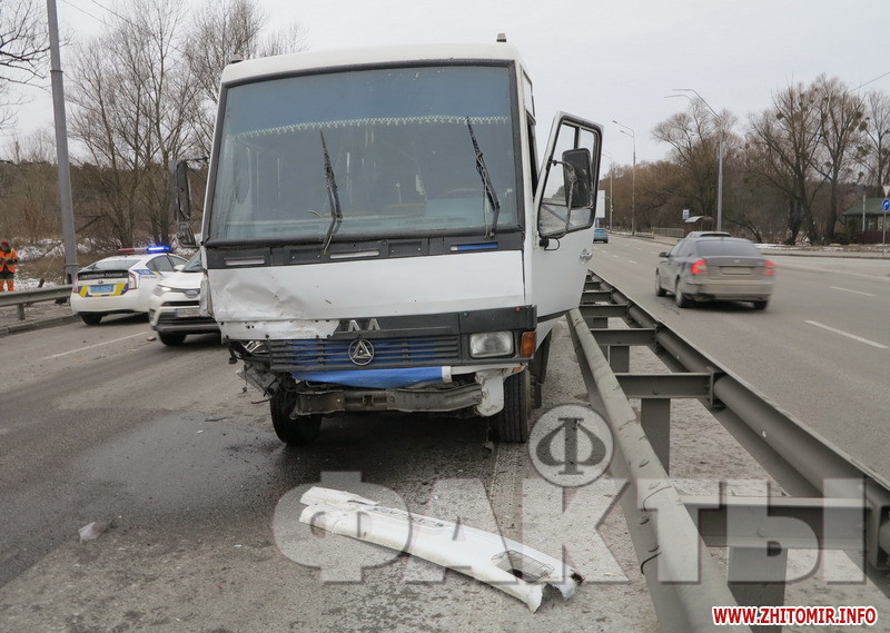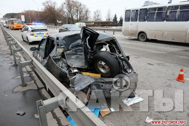 «У суботу, 8 лютого, в Києві на Житомирській трасі відбулась ДТП. Аварія сталася в столиці в другій половині дня неподалік від автостанції Дачна. За попередньою версією, посеред дороги зупинився автомобіль таксі «Дачія», який рухався в бік центра міста і був без пасажирів. Ймовірно, причиною зупинки стала технічна несправність. Через деякий час в легкове авто на повній швидкості врізалась маршрутка «Житомир — Київ». Після потужного удару «Дачію» відкинуло в праву смугу і развернуло на 180 градусів. 33-річного водія в критичному стані госпіталізували. Відомо, що в маршрутці знаходилось 10 пасажирів. Ніхто з них не постраждав, як і її водій», - повідомили «Факти».