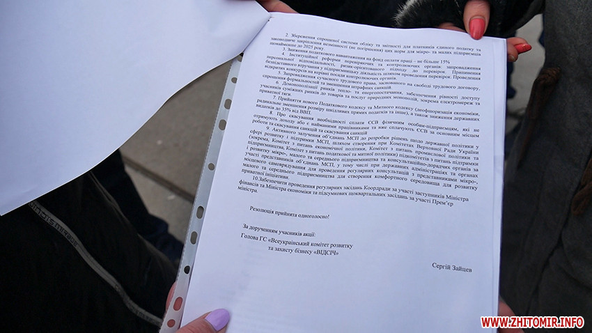 «Сьогодні у нас є незареєстроване громадське об'єднання «Рада місць», яке об'єднує більше як 30 місць. Пізніше буде пряма трансляція з тих міст, які так само проводять таку акції. Відпрацювали звернення до пана президента, прем'єр-міністра Олександра Гончарука, Дмитра Разумкова. Ми просимо, щоб нас почули, сіли за стіл перемовин і ті закони, які були прийняті в «турбо» режимі, які нас знищують, було скасовано», – каже приватний підприємець Сергій Зайцев.