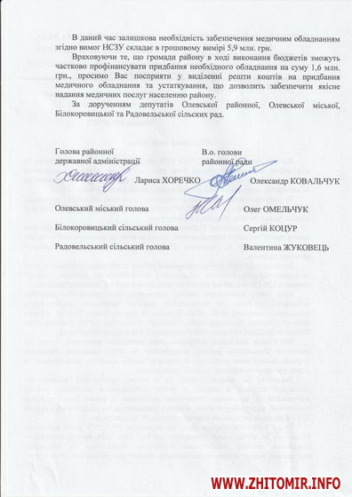 Представники району 10 лютого зустрілись з головою Житомирської ОДА і висловили позицію місцевого населення та наполягали «на терміновому включенні КНП «Олевська центральна лікарня» до опорних лікарень Житомирського госпітального округу.Також звернулися до голови Житомирської ОДА з проханням про виділення коштів на придбання медичного обладнання та устаткування, що дозволить забезпечити якісне надання медичних послуг населенню району».