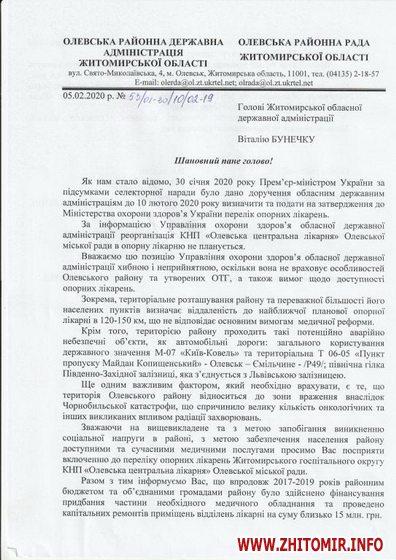 «Керівництво Олевського району та громадськість вважає неприйнятним прийняття рішення про будь яку реорганізацію головного медичного закладу без участі жителів Олевщини. Було прийнято рішення про негайну зустріч з керівництвом Житомирської ОДА та Управління охорони здоров’я стосовно необхідності включення до переліку опорних, саме Олевської лікарні. Серед основних аргументів наголошувалося на складному та віддаленому географічному розташуванню Олевського району та сільських населених пунктів до найближчої планової опорної лікарні на відстані 120-150 км., що не відповідає основним вимогам медичної реформи. Крім того, територією району проходять такі потенційно аварійно-небезпечні об’єкти, як: автомобільні дороги загального користування державного значення М-07 «Київ-Ковель» та територіальна Т 06-05 «Пункт пропуску Майдан-Копищанський» – Олевськ-Ємільчине, північна гілка Південно-західної залізниці. Ще одним важливим фактором, який необхідно врахувати, є те, що територія Олевського району відноситься до зони враження в наслідок Чорнобильської катастрофи, що спричинило велику кількість онкологічних та інших викликаних впливом радіації захворювань», – йдеться у повідомленні.