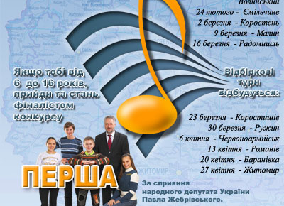 в 12-ти районах області та в місті Житомирі змагалися на сцені за головні номінації. 31-н конкурсант віком від восьми до 16-ти років виконували пісні сучасних українських композиторів. А оцінювало їх журі, до складу якого увійшли співачка, екс-солістка гурту «Віагра» і телеведуча каналу ОРТ Віра Брежнєва, заслужений артист України Юрій Грабовський, композитор і продюсер Валерій Нужда і голова журі народний депутат України Павло Жебрівський. Суворі судді обрали переможцями конкурсу сімох дітей – Тетяну Орлову таІвана Буткалюка з Коростеня, Ольгу Домбровську з Малину, Наталію Цвік із Радомишля, Аліну Ковальчук з Баранівки, Івана Вінниченко та Катерину Каркушко з Овруча. Приз глядацьких симпатій отримала найменша учасниця конкурсу восьмирічна Даринка Іванова з Коростишева. Спеціальний приз організаторів дістався житомирянці Катерині Сарабанович. До слова жоден з учасників конкурсу не залишився без призів – кожному вручили ДВД-програвач та срібний медальйон у формі логотипу «Першої ноти». Переможцям конкурсу доведеться ще раз продемонструвати свої таланти, але вже більш широкій аудиторії – 26 липня на Соборному майдані, під час святкування Дня народження радіо «Житомирська хвиля». Нагадаємо, що організаторами проекту «Перша нота» виступила «Житомирська хвиля» та студія «Ц-ТВ».