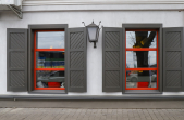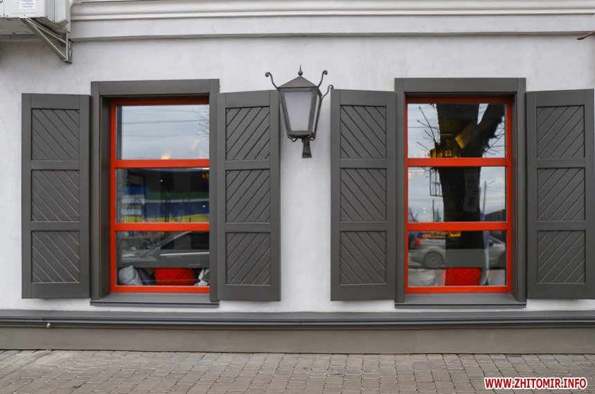 Також у середмісті Житомира 27 лютого наша фотокореспондентка знайшла будівлю з сучасними віконницями, якими декороване кафе.