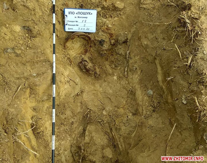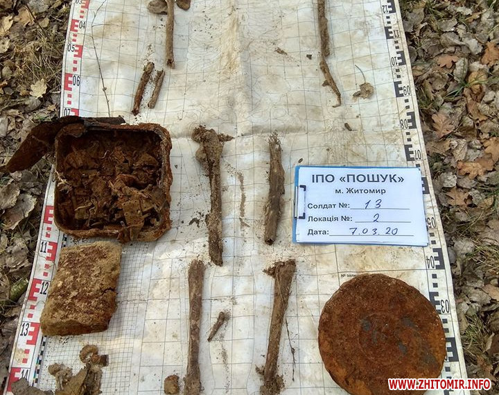 «Сьогоднішній день був досить продуктивним. Працювали у Пулинському районі на новій локації. Завдяки злагодженій роботі всієї команди вдалося знайти останки 3-х солдат РСЧА. Всі вони загинули в липні 41-го року. 1-й солдат був на глибині 50 см, мав при собі каску СШ-39 та підсумок. 2-й солдат знаходився в чагарнику на глибині 60 см. Солдат лежав в окопі, довкола нього валялися гільзи, що свідчить про те, шо він загинув у бою під час артилерійського обстрілу. У протигазній сумці лежав годинник з бронетехніки, поряд була каска СШ-39 та підсумки. Під головою лежав ящик з під кулемета Максим пробитий осколком, а під ящиком лежав диск до ДП-27, а саме головне, що у солдата в нагрудній кишені був медальйон! 3-й солдат був неподалік від першого. Мав при собі каску СШ-39, підсумки, олівці, саперну лопату та перев'язочний пакет в якому дуже гарно зберігся бинт. Сподіваємось, що ім'я другого солдата буде встановлено», – йдеться у повідомленні.