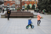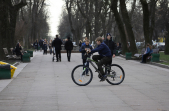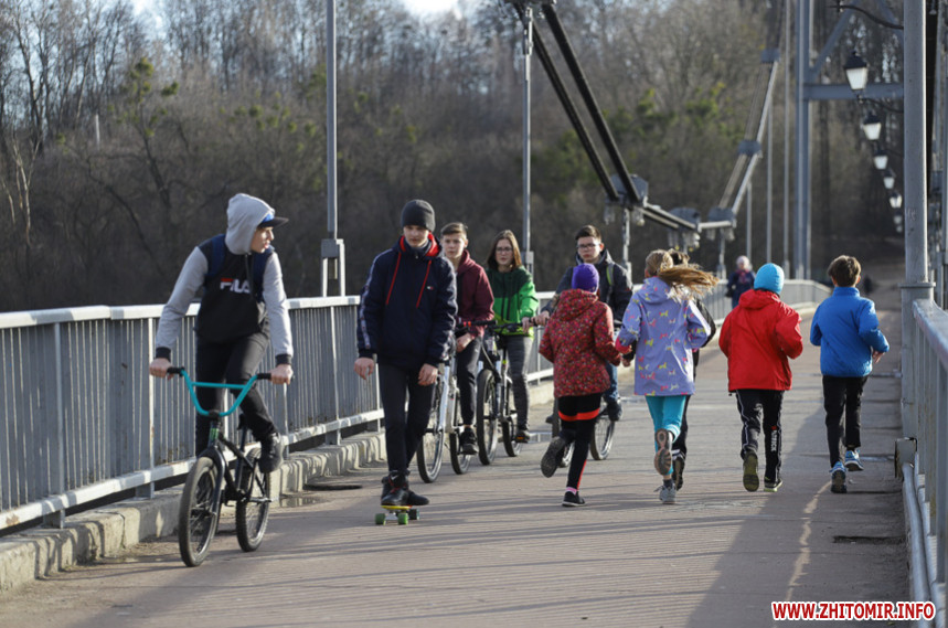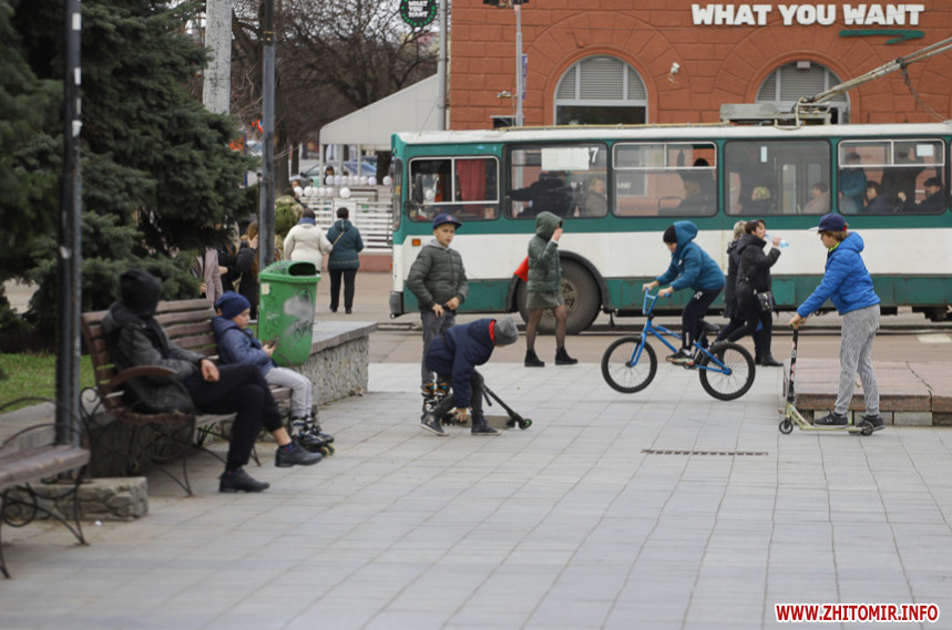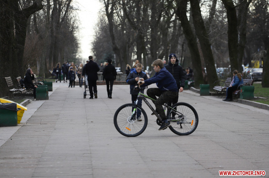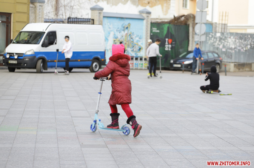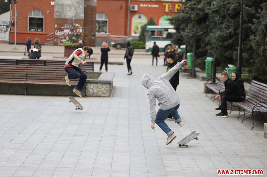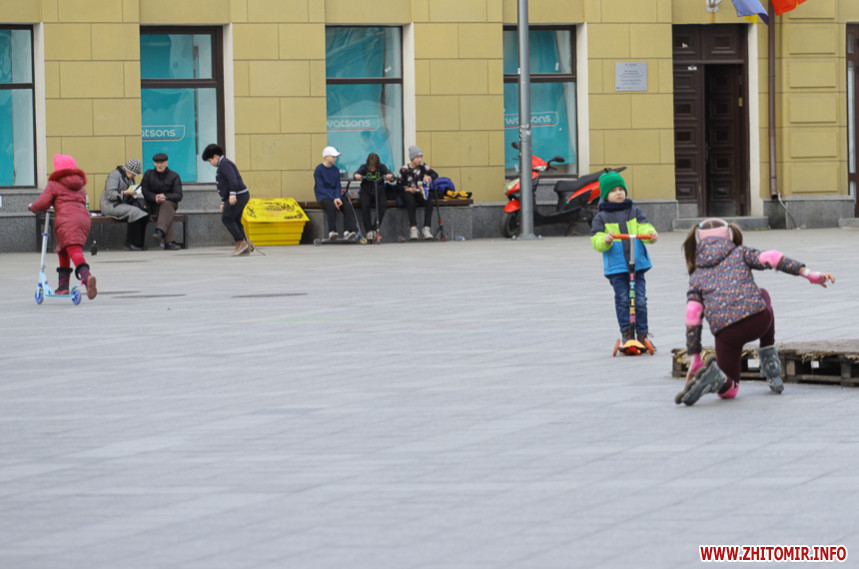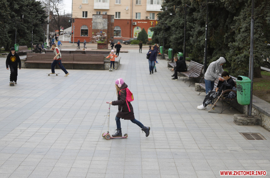 Втім, погода 12 березня справді весняна й діти активно відпочивають в центрі Житомира – катаються на скейтах і самокатах на Михайлівській та біля Соборного майдану, розважаються в парку.