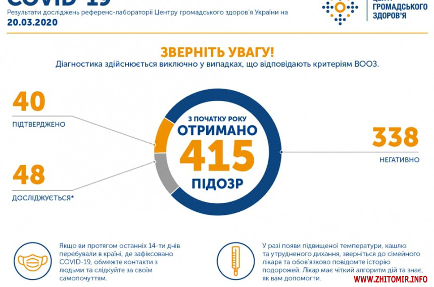 Як повідомляв Житомир.info, станом на ранок 20 березня в Україні зафіксовано 26 лабораторно підтверджених випадків зараження COVID-19: 15 у Чернівецькій області, 2- у Дніпропетровській, 2 – у Київській області, 3- у місті Київ, 2- у Житомирській області, по одному – у Івано-Франківській та Донецькій областях. З них три летальні випадки – у Чернівецькій, Івано-Франківській та Житомирській областях.