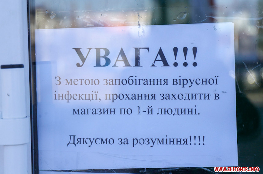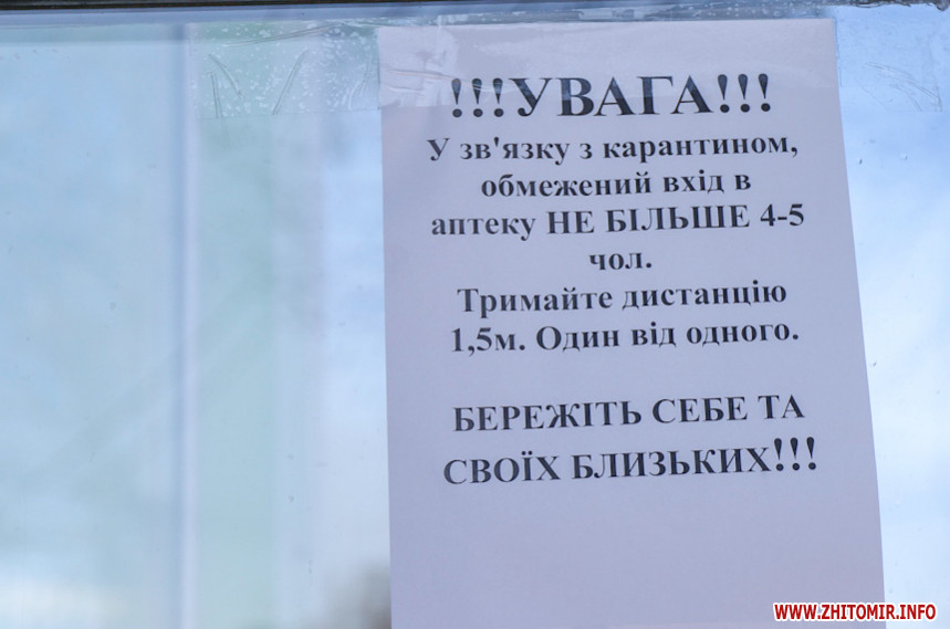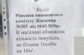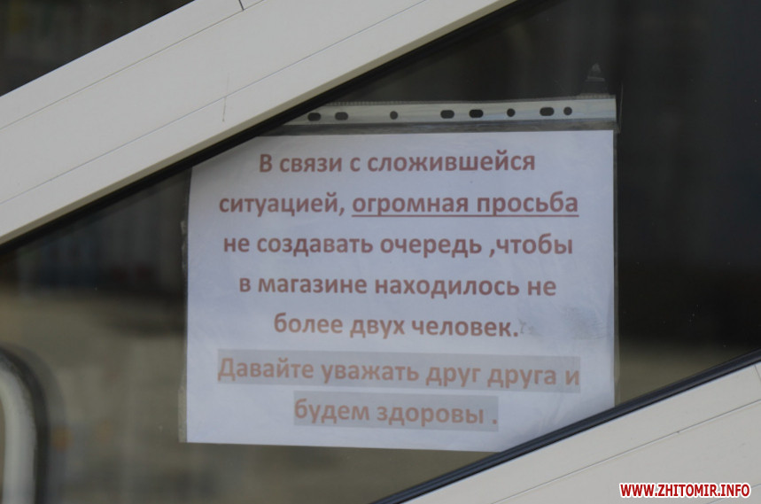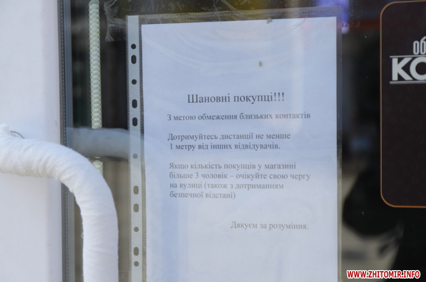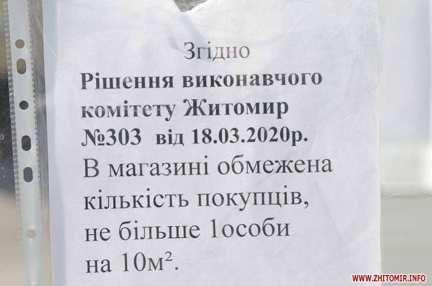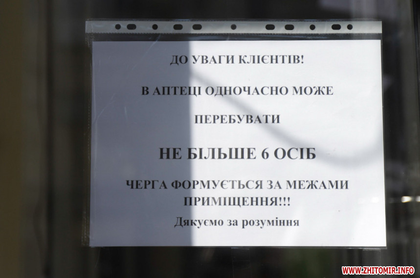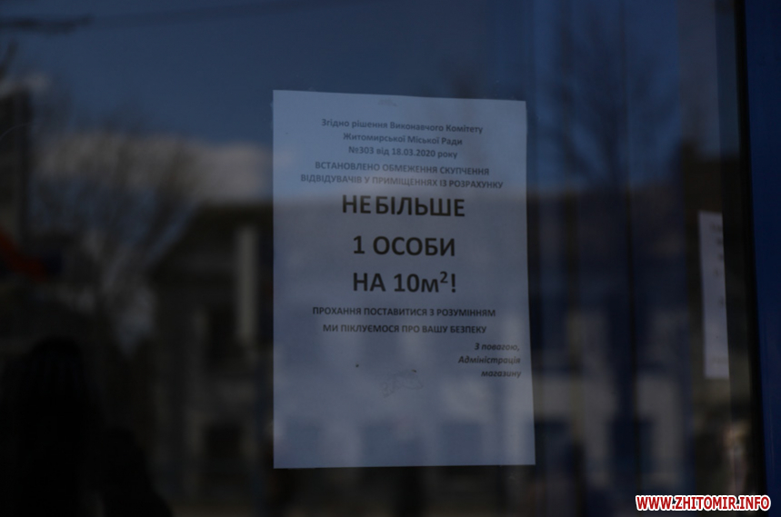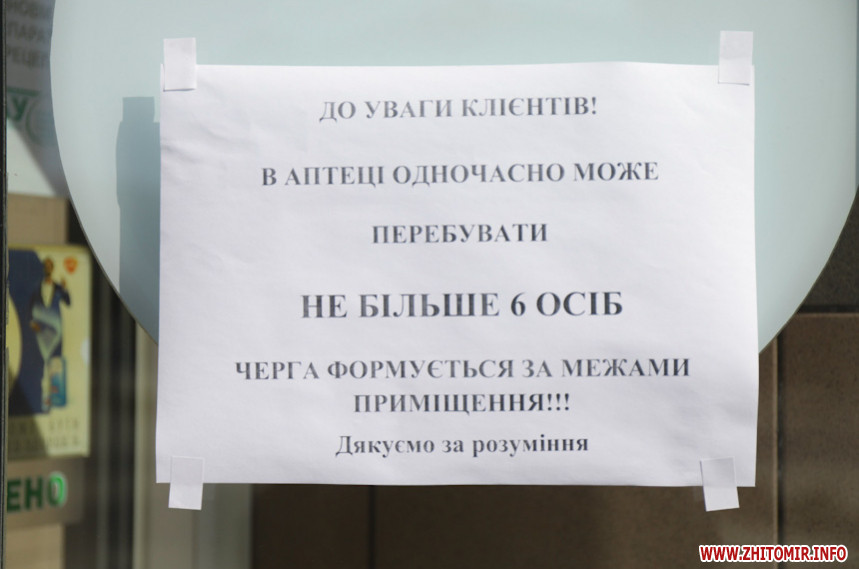 При вході в аптеки, продуктові магазини, заклади зв’язку, яким дозволено працювати під час карантину, для відвідувачів розмістили оголошення про обмеження. Житомирян просять не заходити до приміщення більше однієї людини на 10 кв.м, тримати дистанцію і чергу формувати на вулиці.