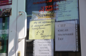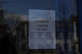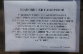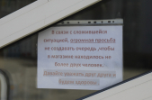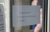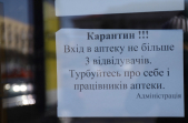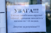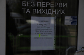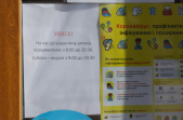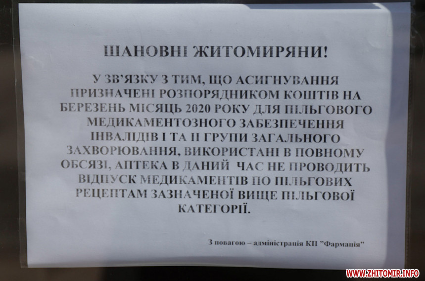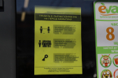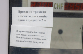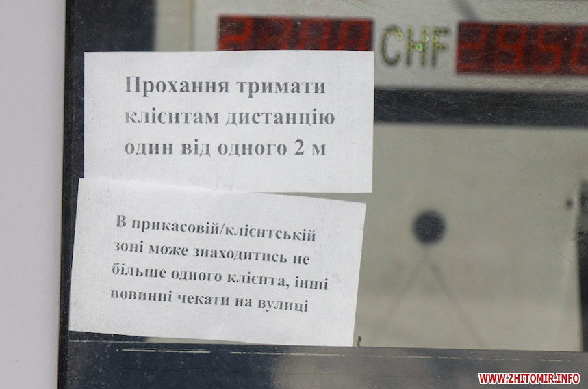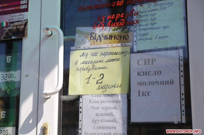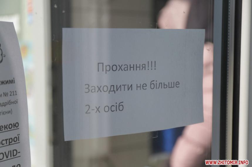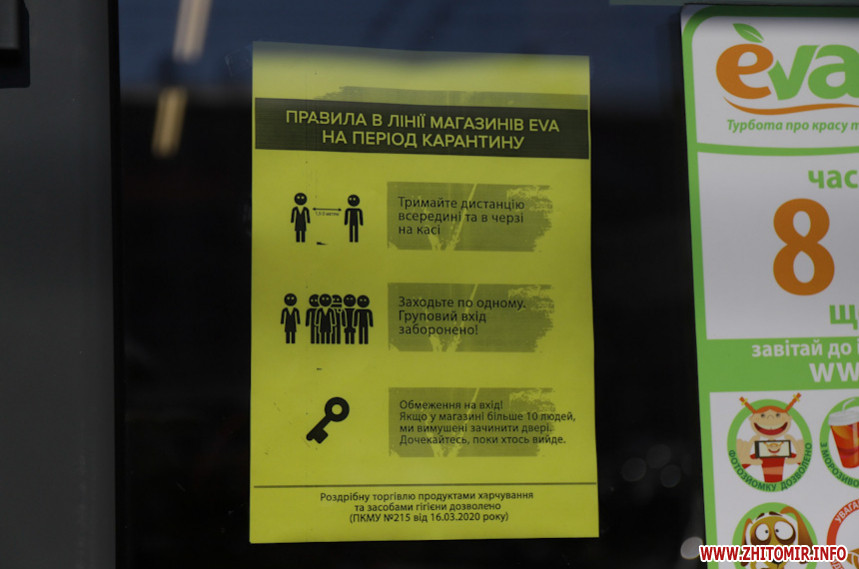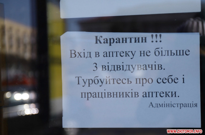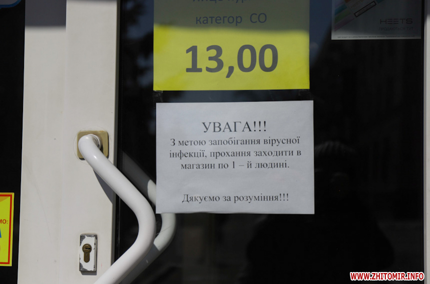 При вході в аптеки, продуктові магазини, заклади зв’язку, яким дозволено працювати під час карантину, для відвідувачів розмістили оголошення про обмеження. Житомирян просять не заходити до приміщення більше однієї людини на 10 кв.м, тримати дистанцію і чергу формувати на вулиці.