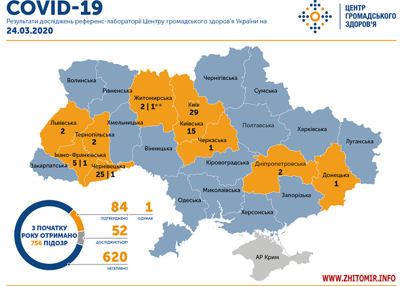 «За результатами досліджень вірусологічної референс-лабораторії Центру та обласних лабораторних центрів загалом підтверджено 84 випадки COVID-19.